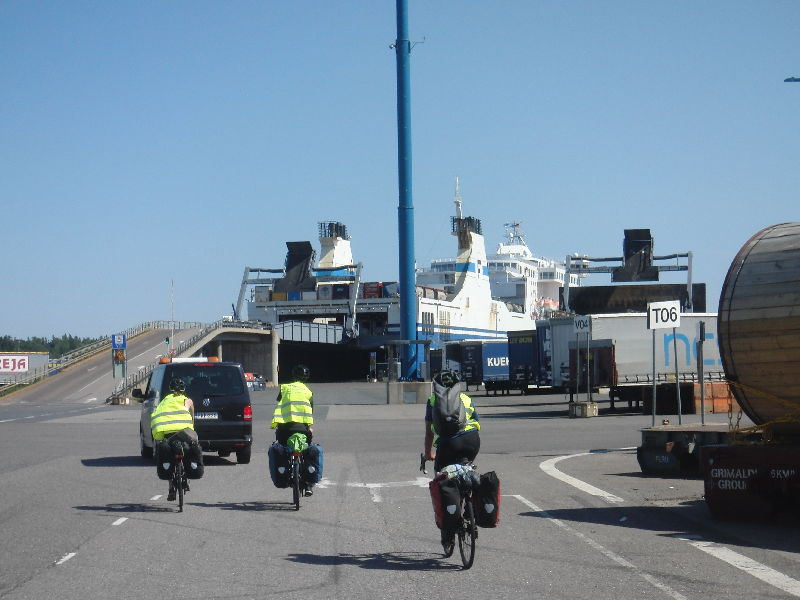 Und wieder Radler, die aus dem Nichts auftauchen. Fährhafen (Ost) Helsinki - Travemünde. Man fährt dem Lotsenauto nach durchs Hafengelände.